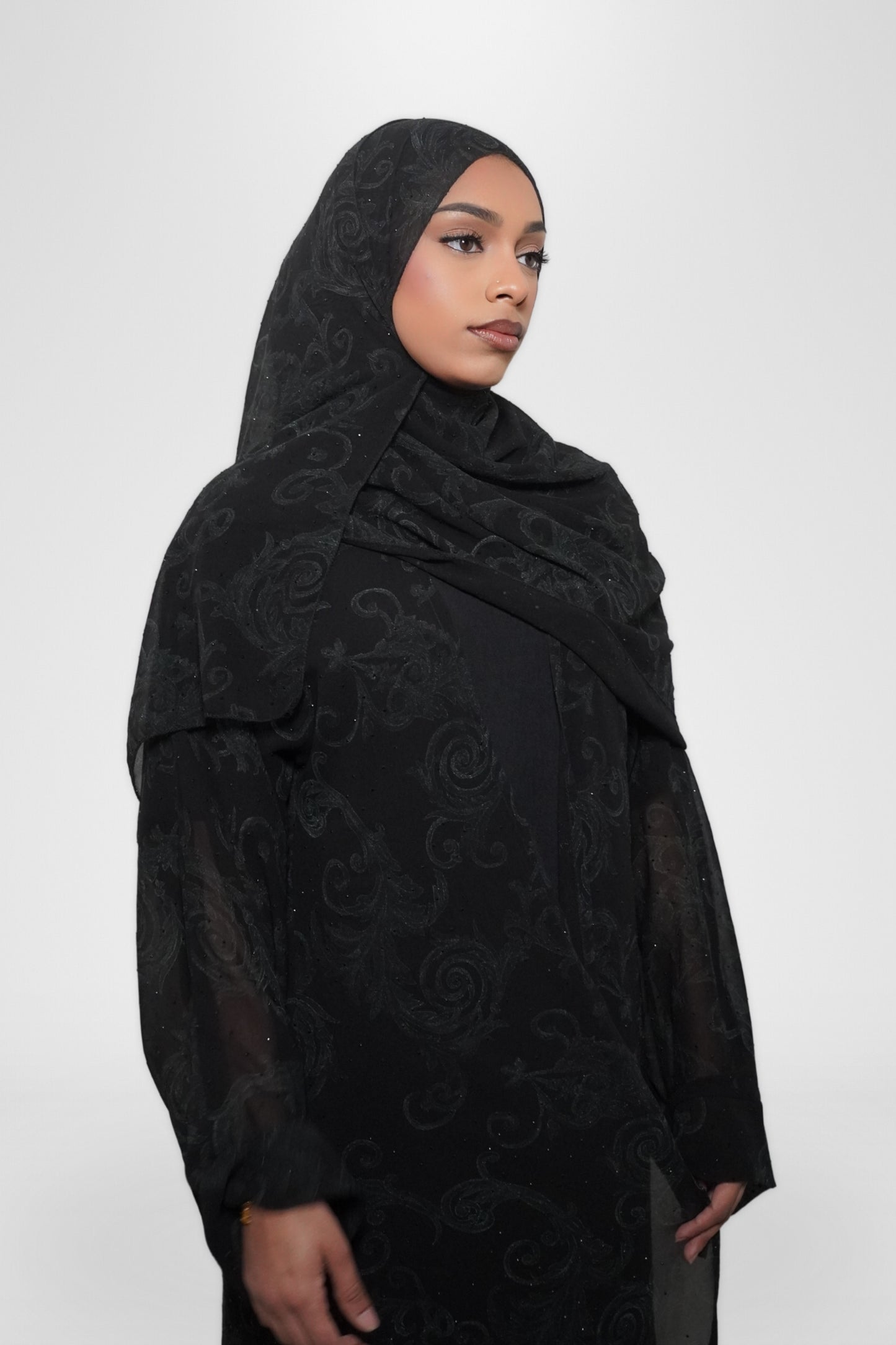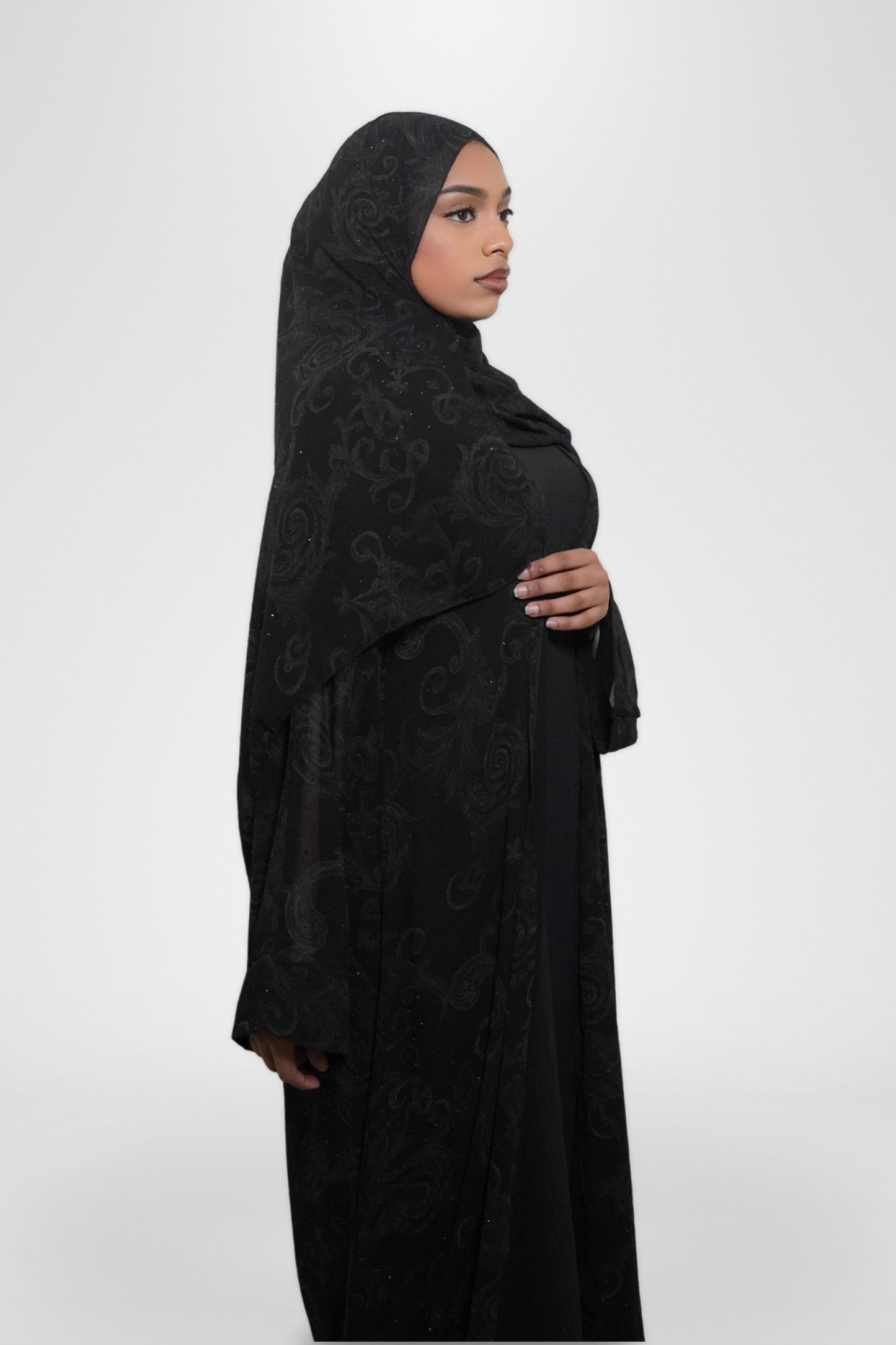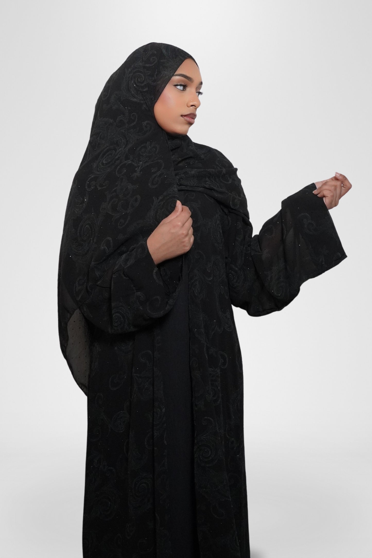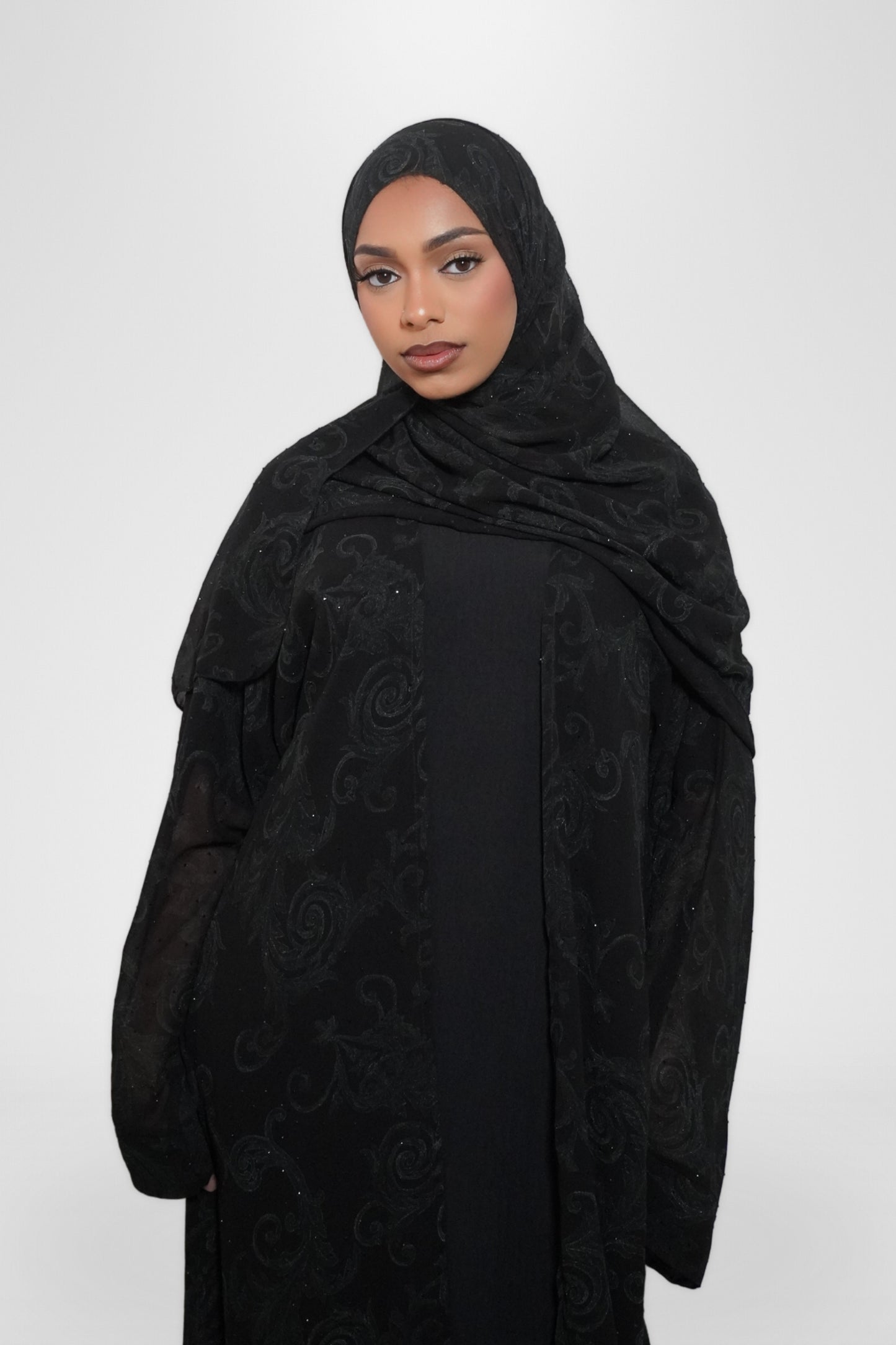 Our Samar Abaya Set is a three-piece ensemble that exudes elegance and sophistication. It includes a black underdress, a flowy open abaya adorned with intricate embroidery and shimmering gemstones, and a matching hijab. The open abaya’s delicate details and sparkling accents create a timeless look, perfect for formal occasions or elevating your everyday wardrobe.