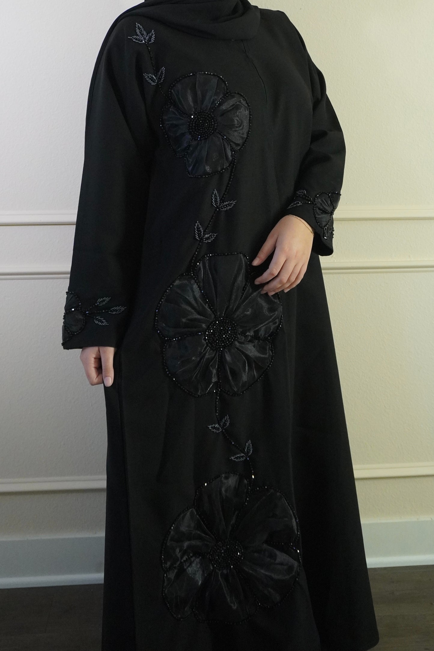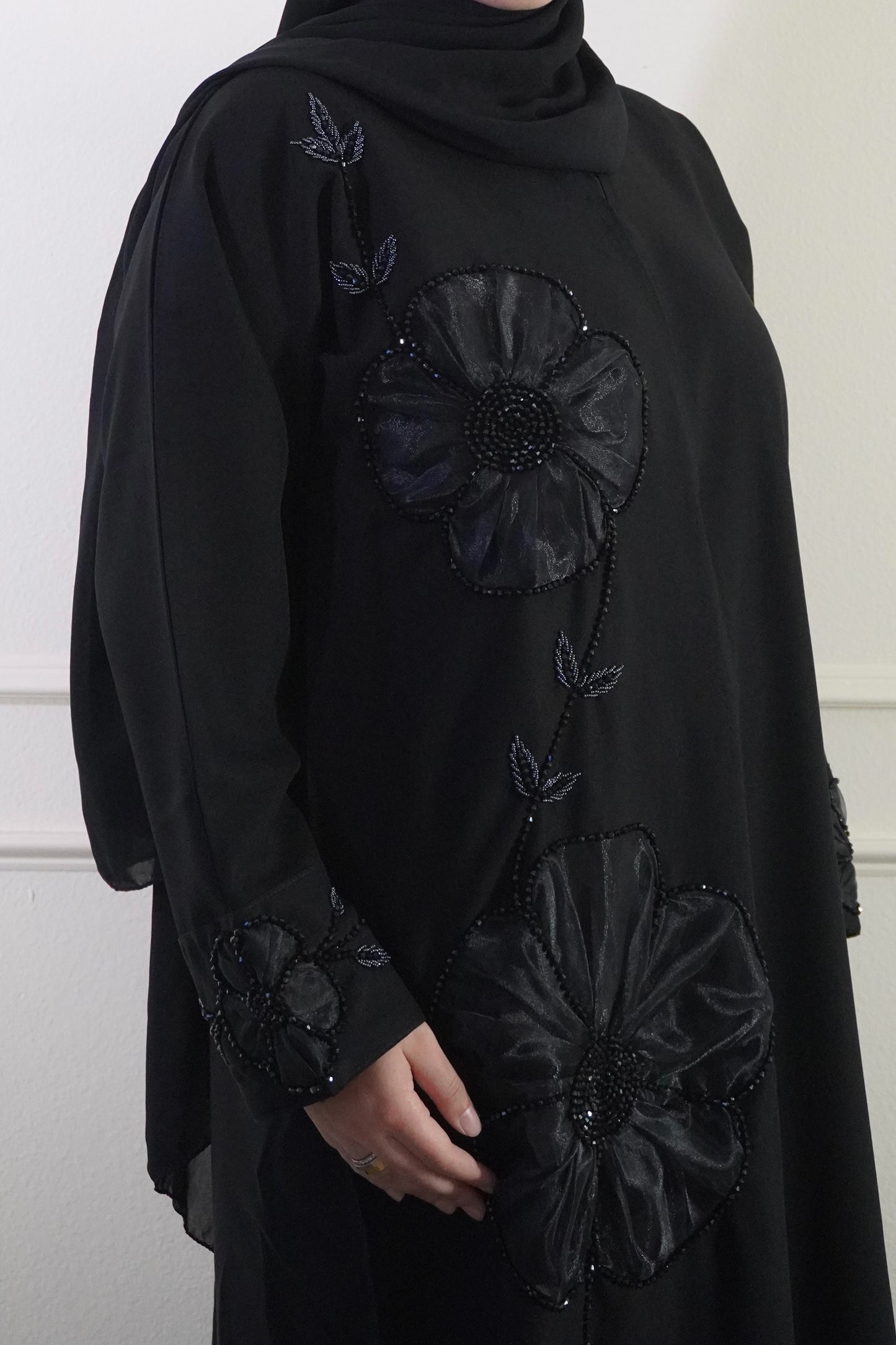 Our Nadra is a beautiful black abaya featuring large 3D floral details with subtle beadwork that catch the light. Crafted from slightly structured fabric, it holds a graceful, polished silhouette, with matching floral accents on the sleeves making it perfect for special occasions.