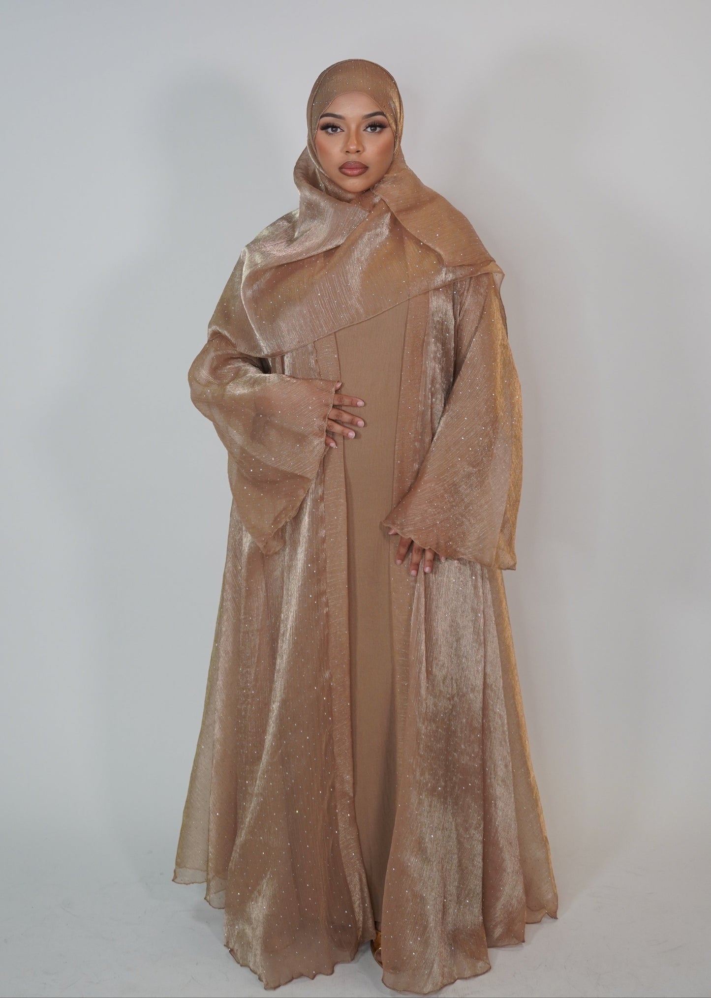 Regular price $44.99Elevate your wardrobe with Lujain Abaya, a perfect fusion of grace and glamour. Crafted from organza fabric, this abaya features a soft shimmer that catches the light beautifully, creating an ethereal, flowing silhouette. The delicate, airy material ensures both comfort and sophistication, making it an ideal choice for special occasions, Eid, weddings, or evening events. The wide, bell sleeves add a regal touch, while the subtle glitter details enhance its luxurious appeal.
