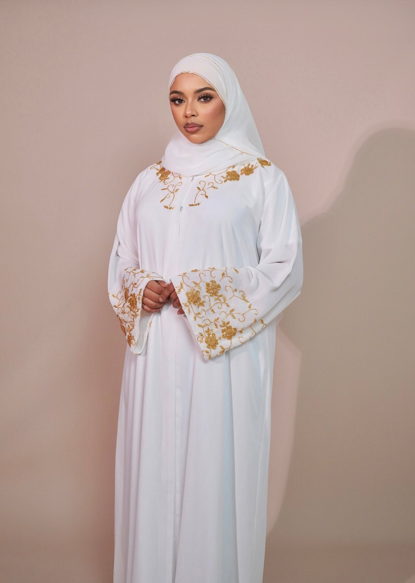 This stylish black abaya features elegant floral beads on the cuffs, adding a touch of charm to the classic design. Its flowing, comfortable fabric offers modesty and ease, making it a perfect choice for any occasion.