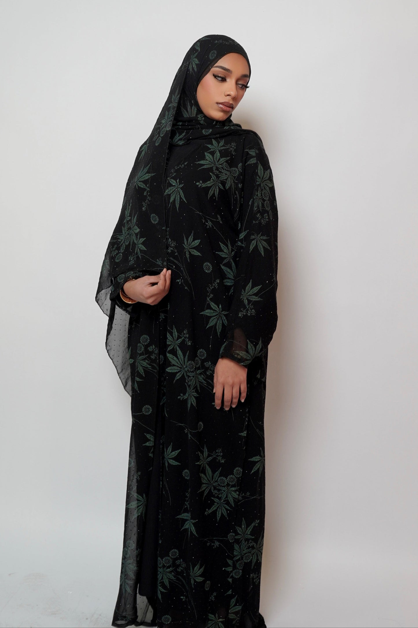 The Layal Abaya Set is a luxurious three-piece ensemble that exudes elegance and sophistication. It includes a black underdress, a flowy open abaya adorned with intricate leaf embroidery and shimmering gemstones, and a matching hijab. The open abaya’s delicate details and sparkling accents create a timeless look, perfect for formal occasions or elevating your everyday wardrobe.