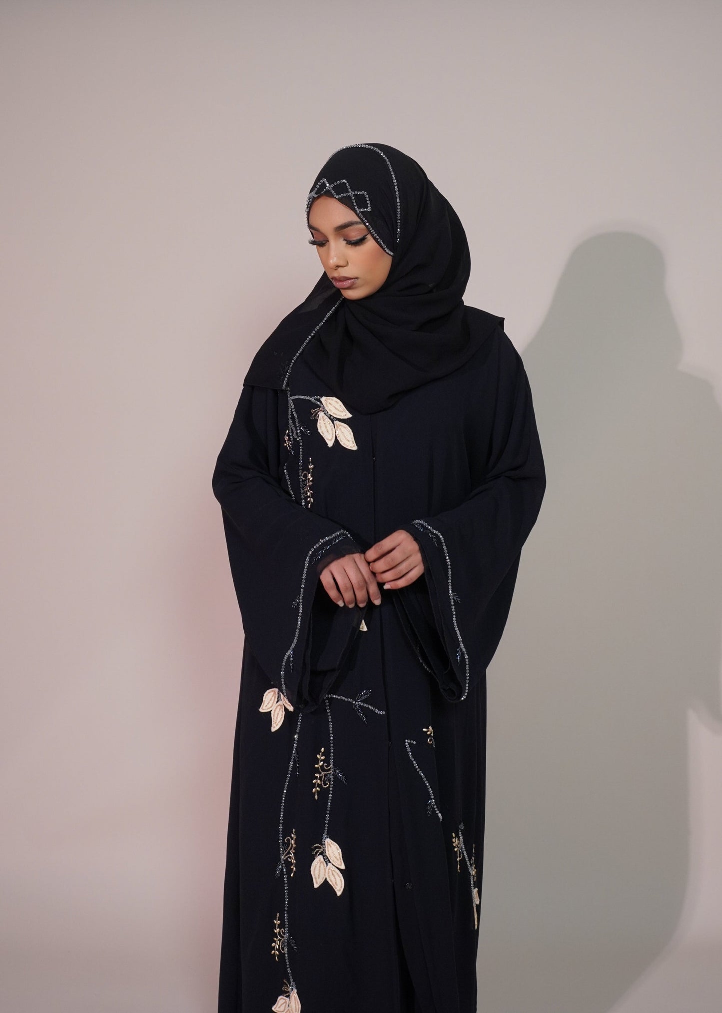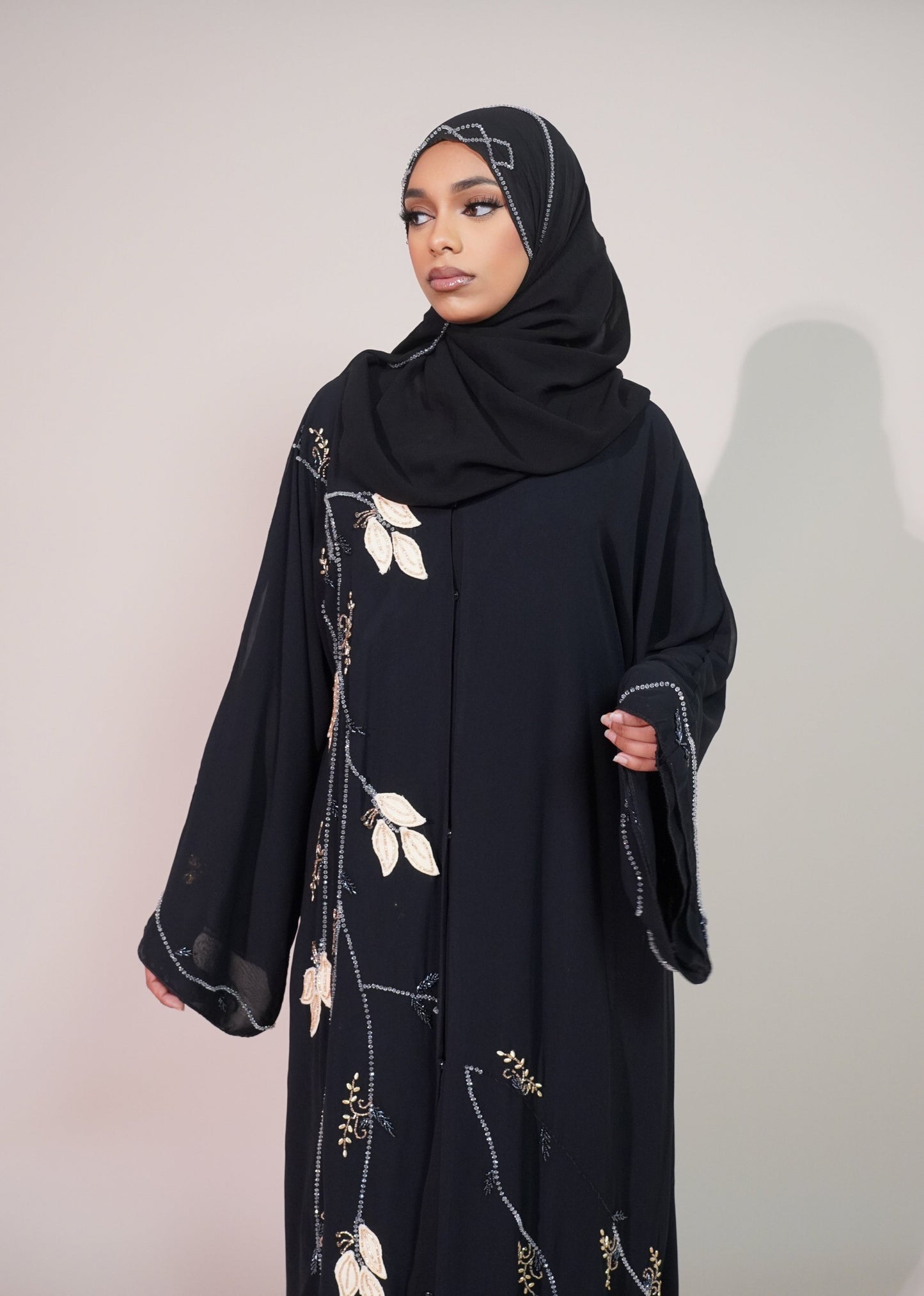 This stylish black abaya features elegant floral beads on the cuffs, adding a touch of charm to the classic design. Its flowing, comfortable fabric offers modesty and ease, making it a perfect choice for any occasion.