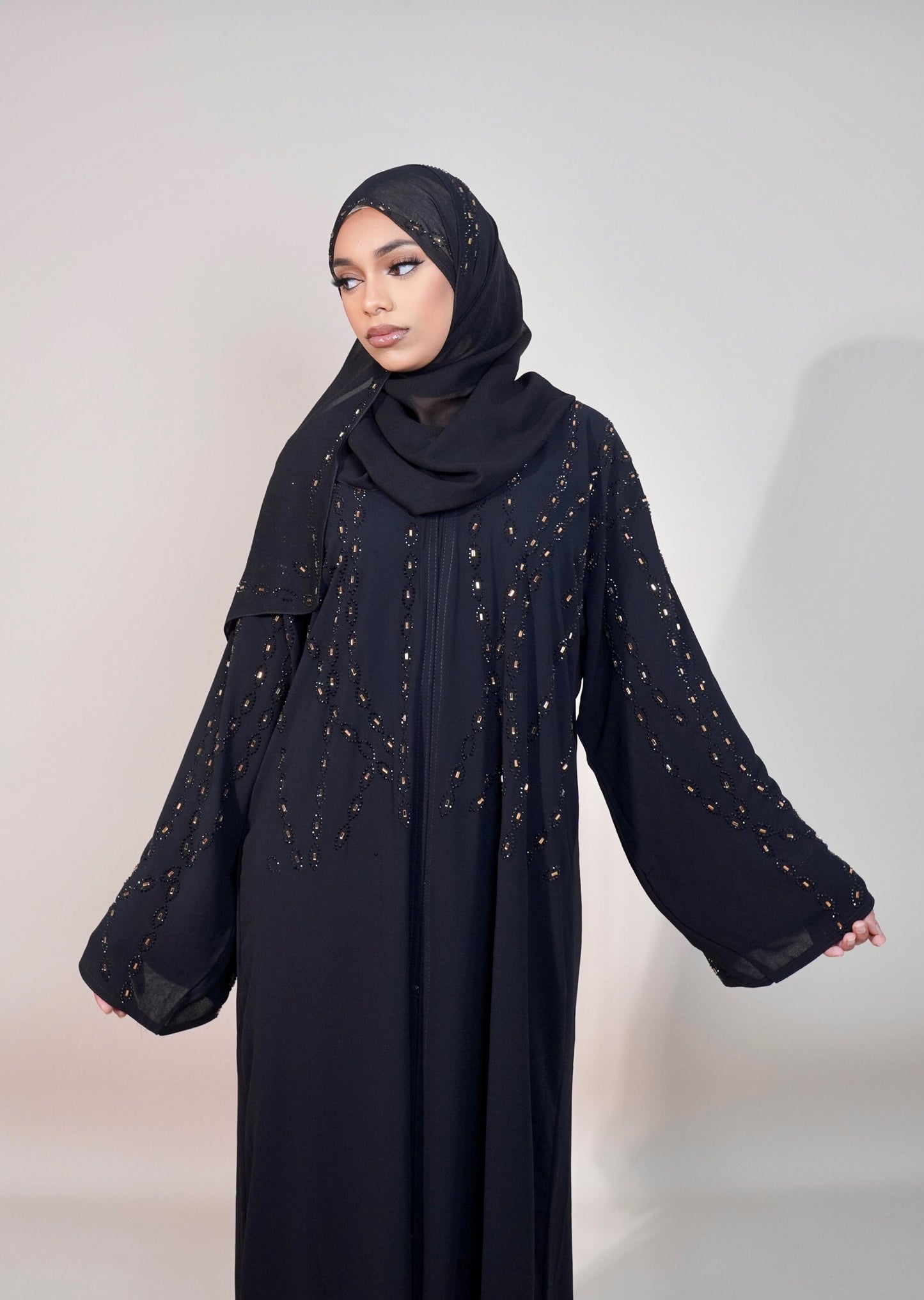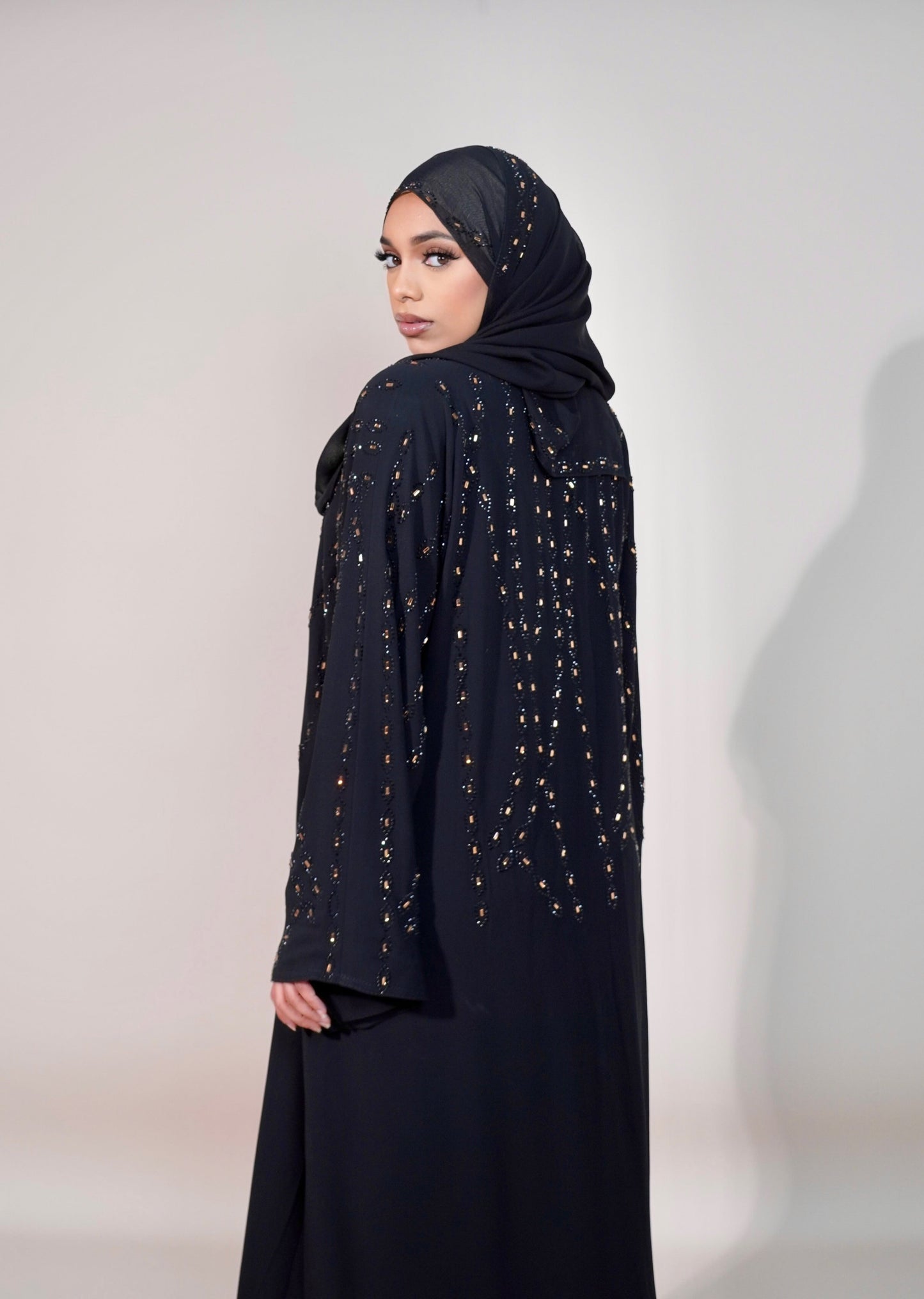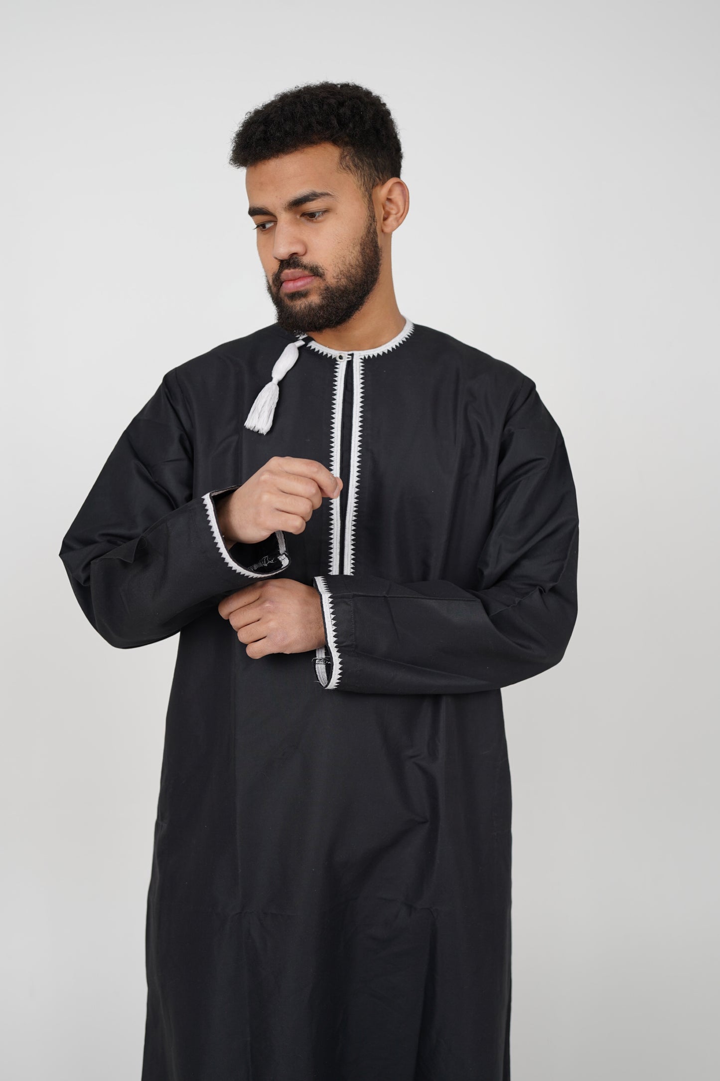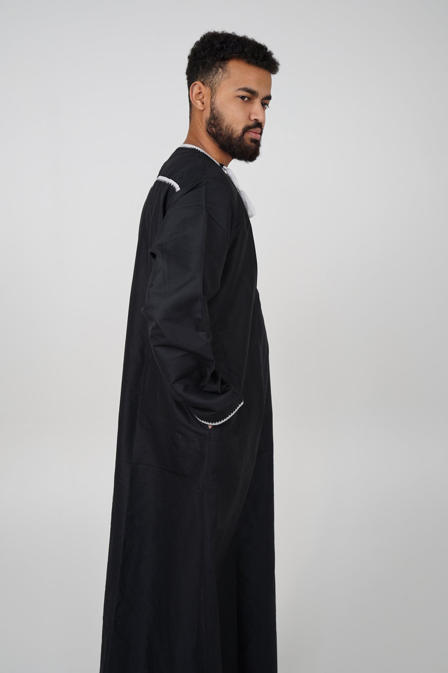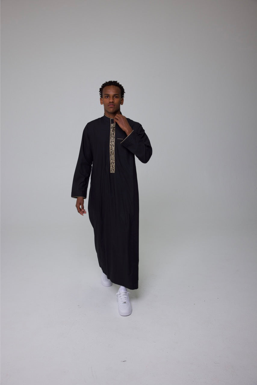 BLACK ARABESQUE THOBE WITH GOLD EMBROIDERY