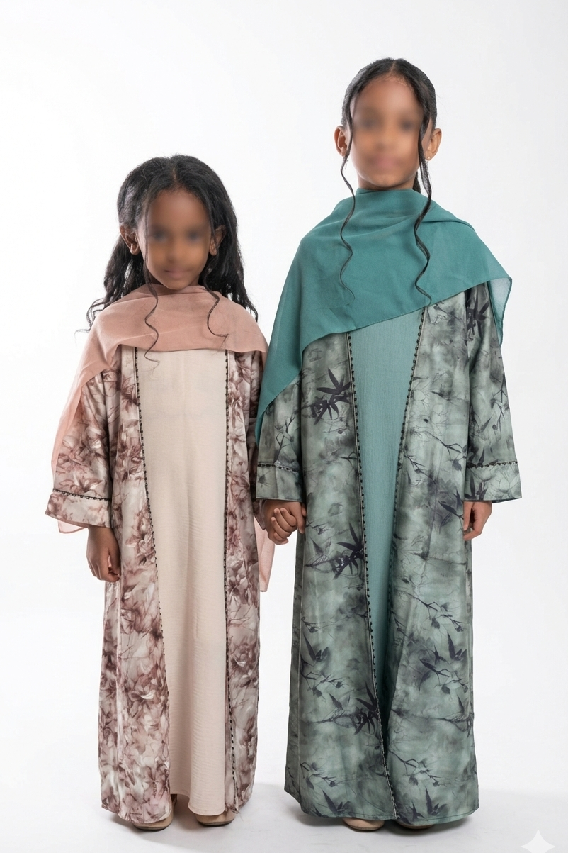 The Amira kids Abaya set is a three-piece ensemble that blends elegance with timeless charm. It features a open abaya adorned with intricate flower-inspired prints. It comes with a matching chiffon hijab, and underdress making it perfect for special occasions or enhancing your kids everyday style.