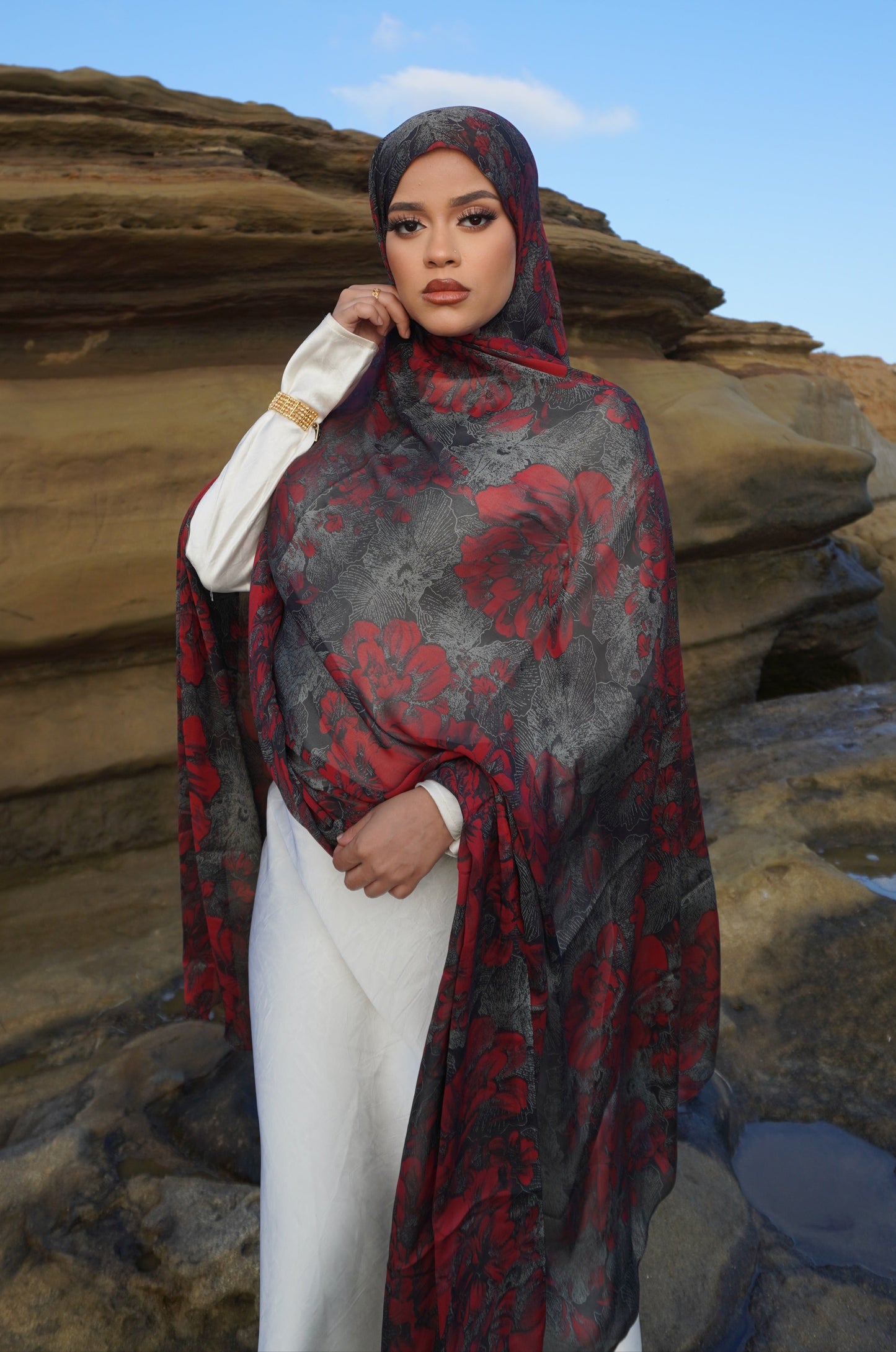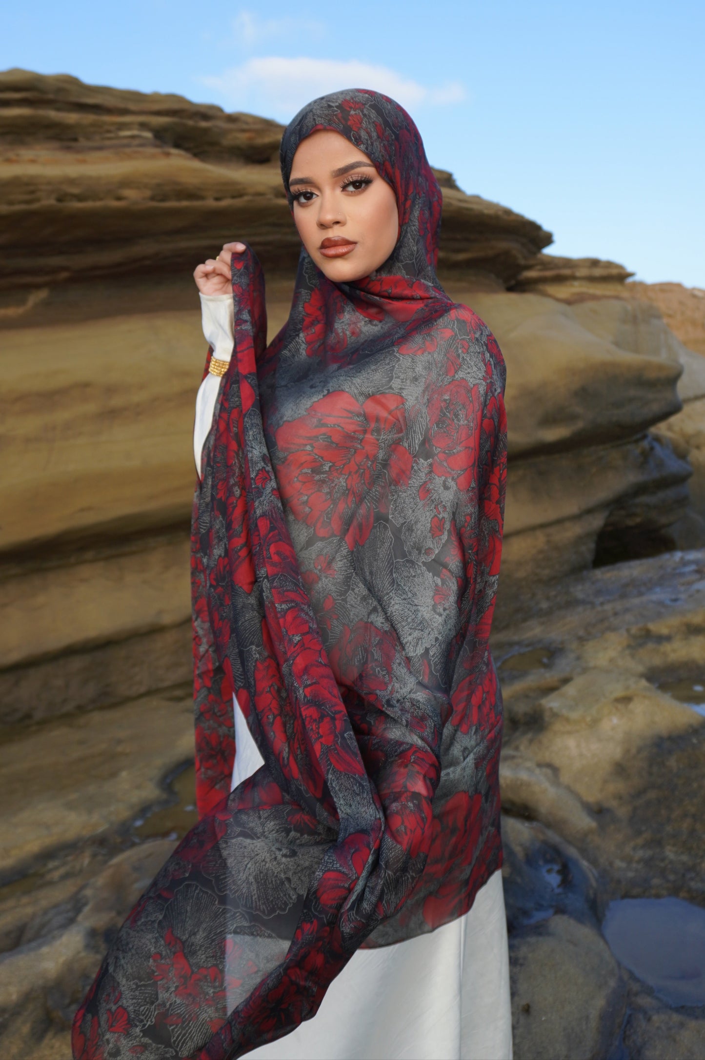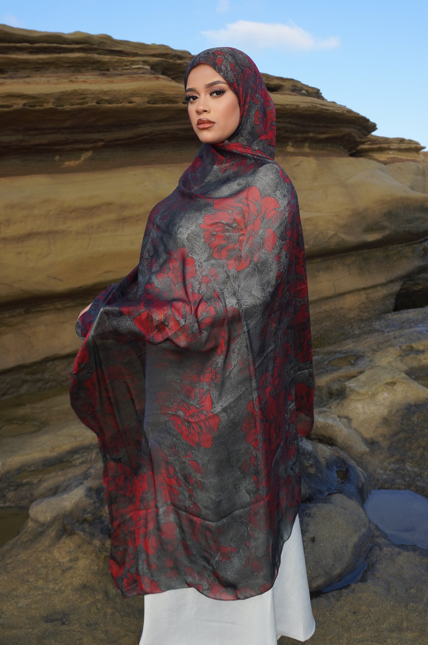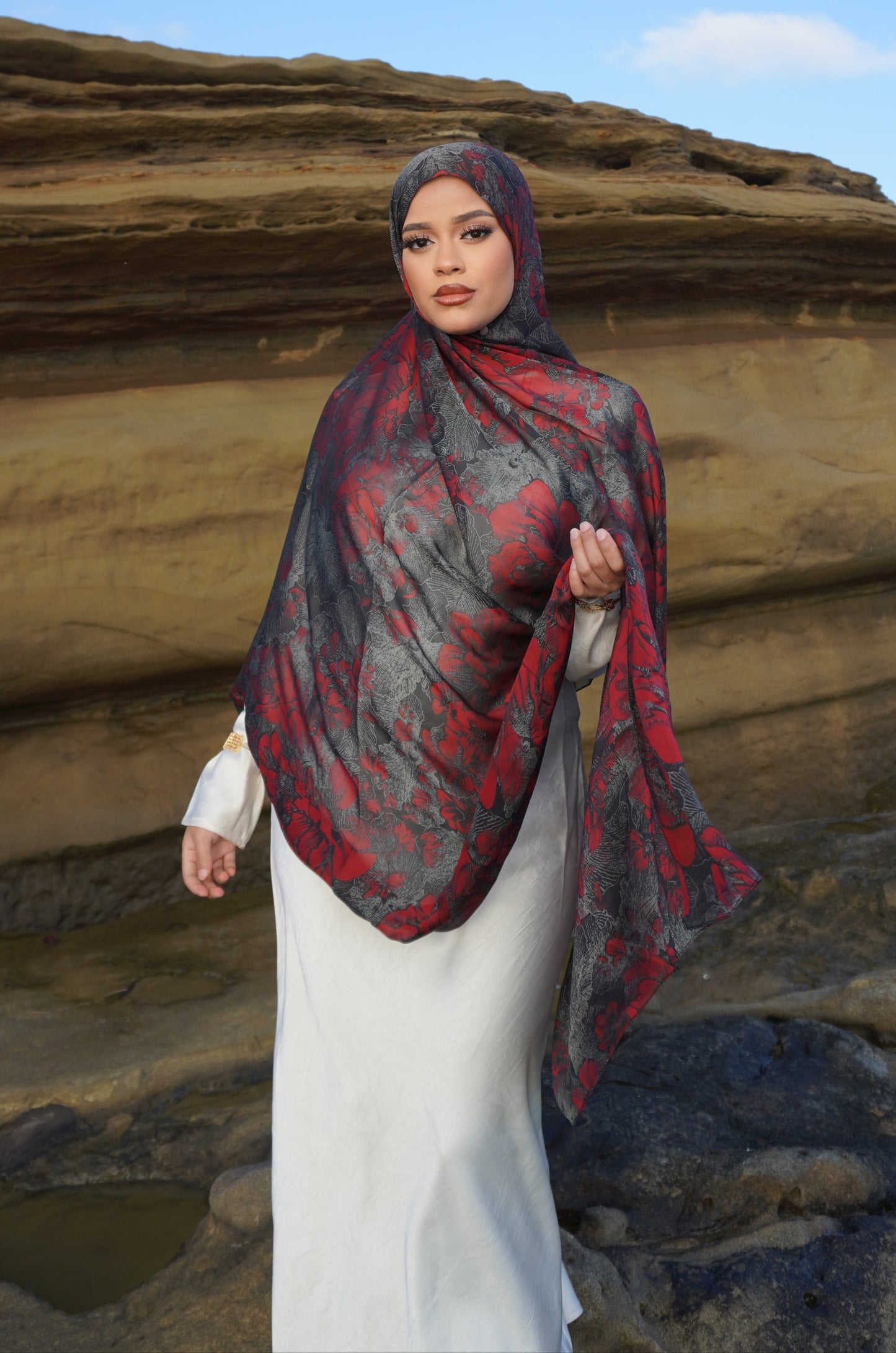 Our Alevra print hijab features a stylish satin chiffon watercolor design and raw edges for a seamless lay. Perfect for staying on-trend while maintaining modesty.