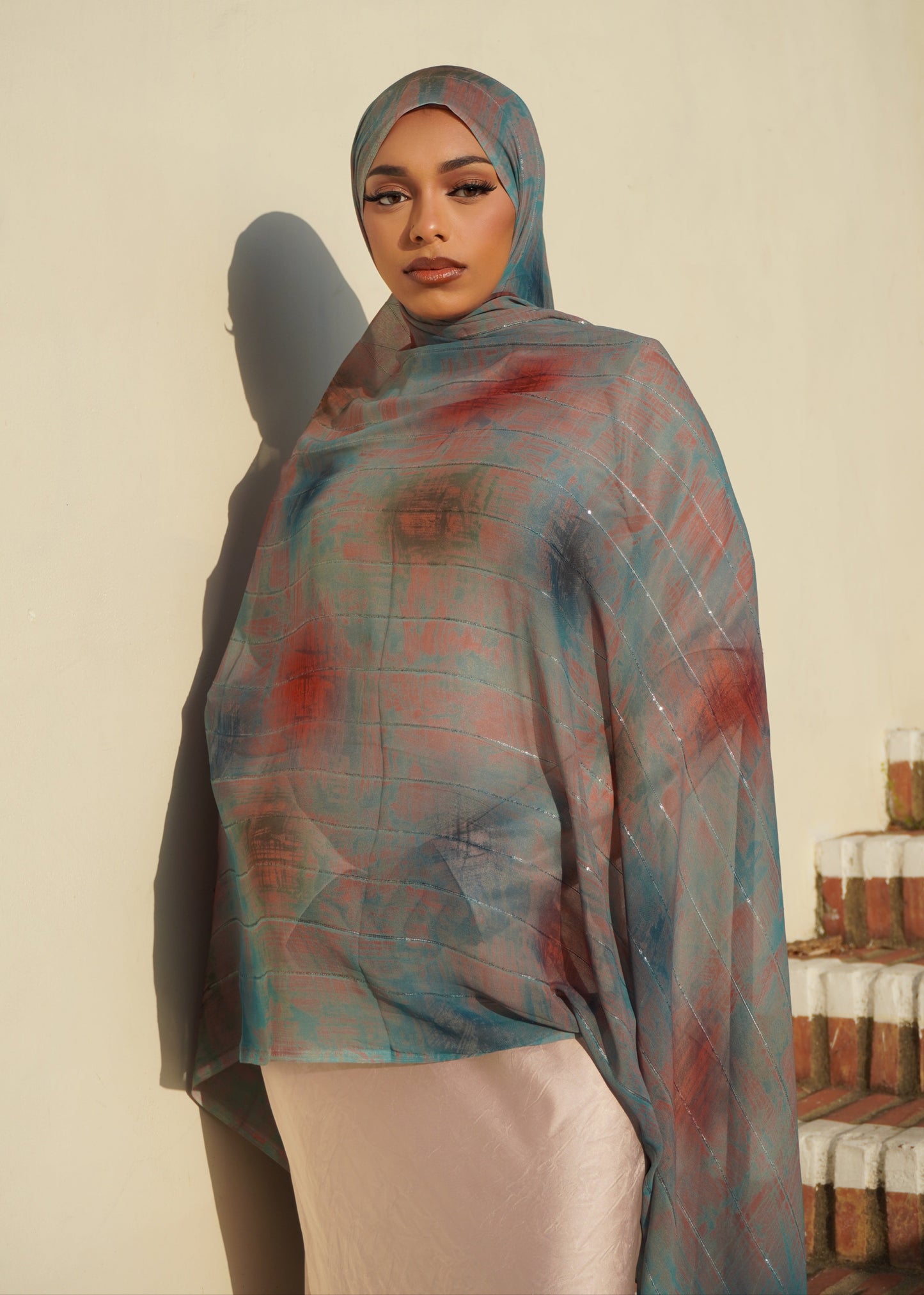 Our Seaflare print hijab features a stylish satin chiffon watercolor design and raw edges for a seamless lay. Perfect for staying on-trend while maintaining modesty.