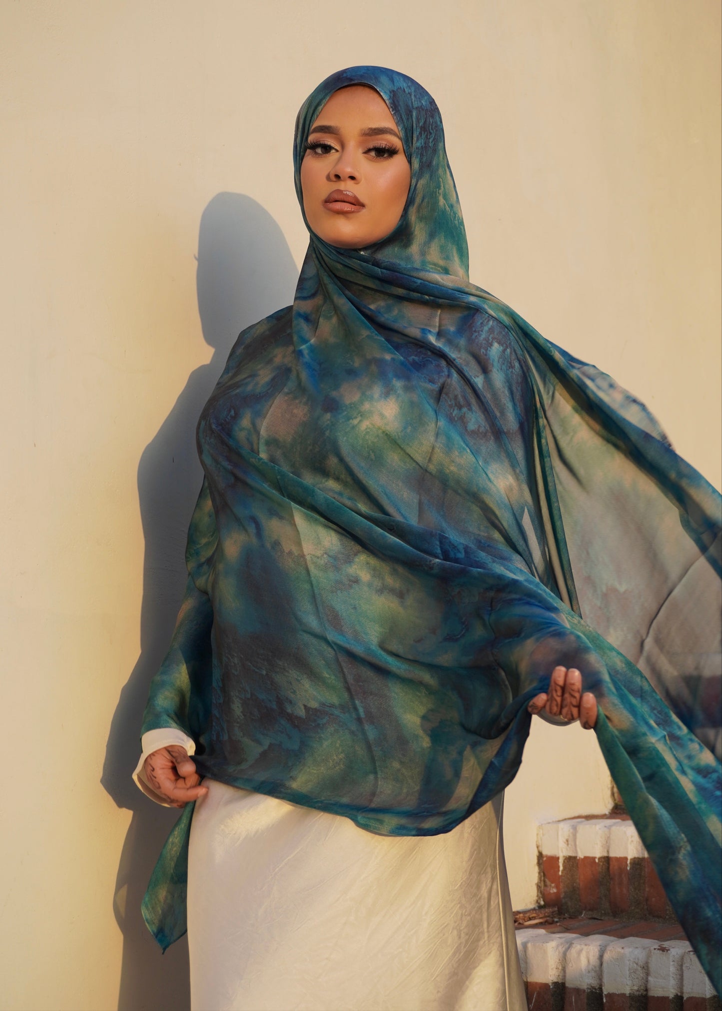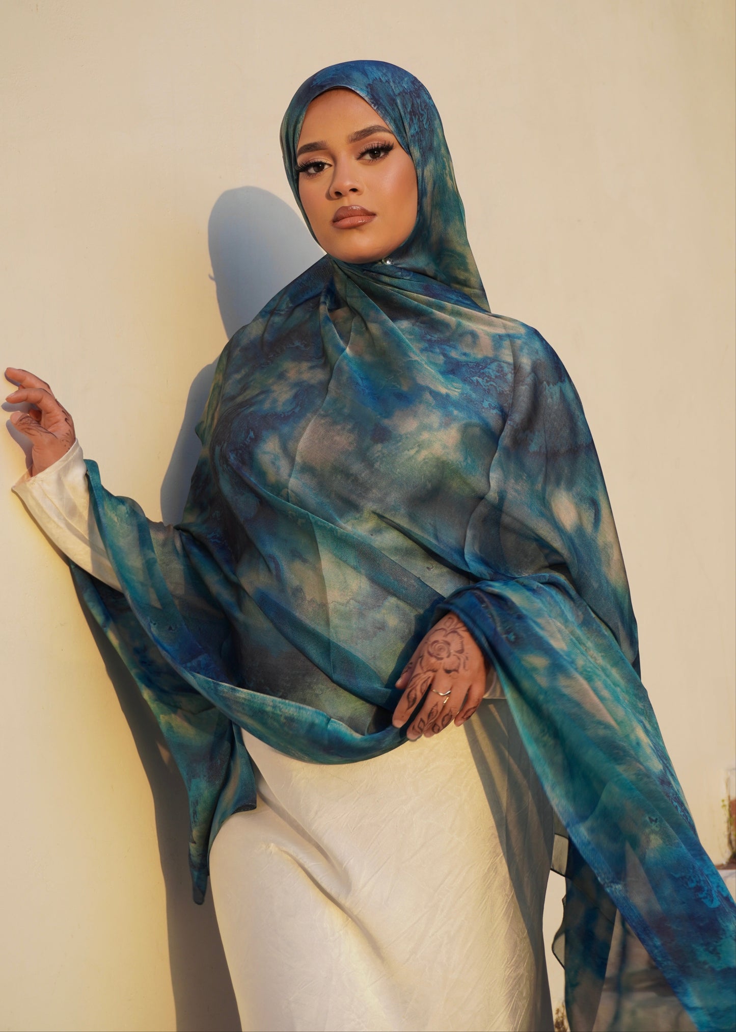 Our Aquafera print hijab features a stylish satin chiffon watercolor design and raw edges for a seamless lay. Perfect for staying on-trend while maintaining modesty.