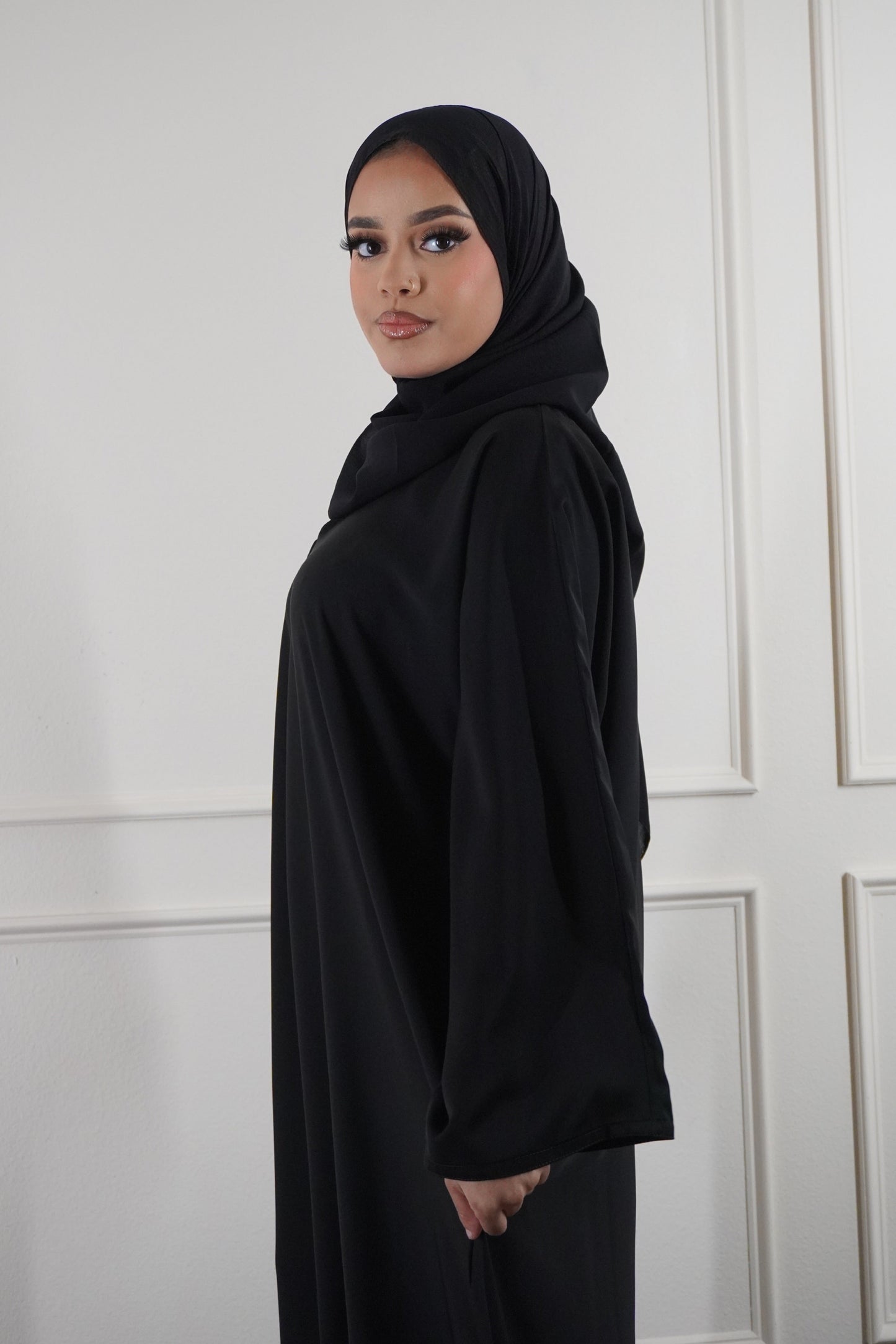 A timeless plain black abaya designed for effortless elegance. Made from soft, flowing Nada material, it drapes beautifully while remaining comfortable for all day wear. Simple, modest, and easy to style for any occasion.