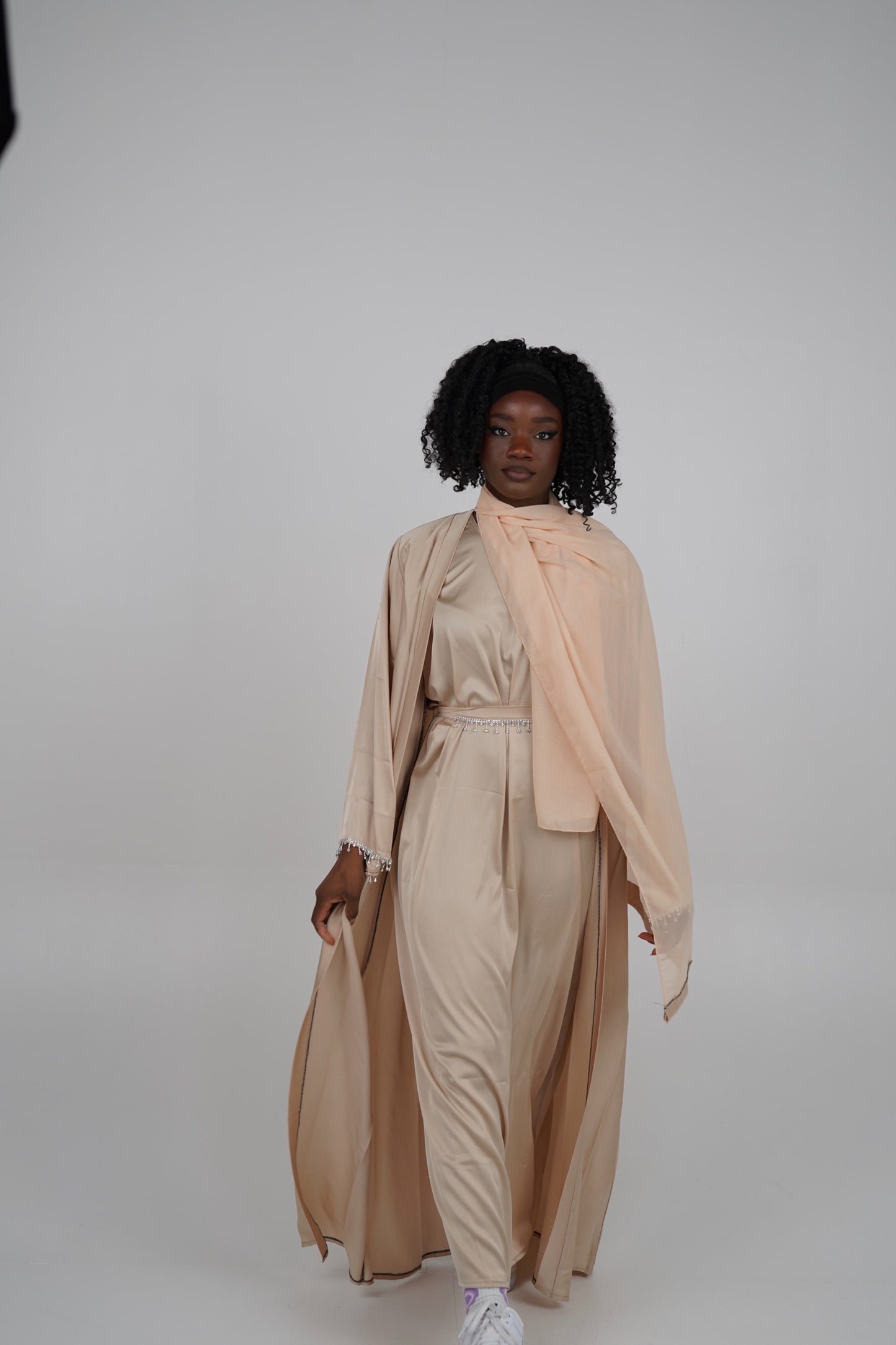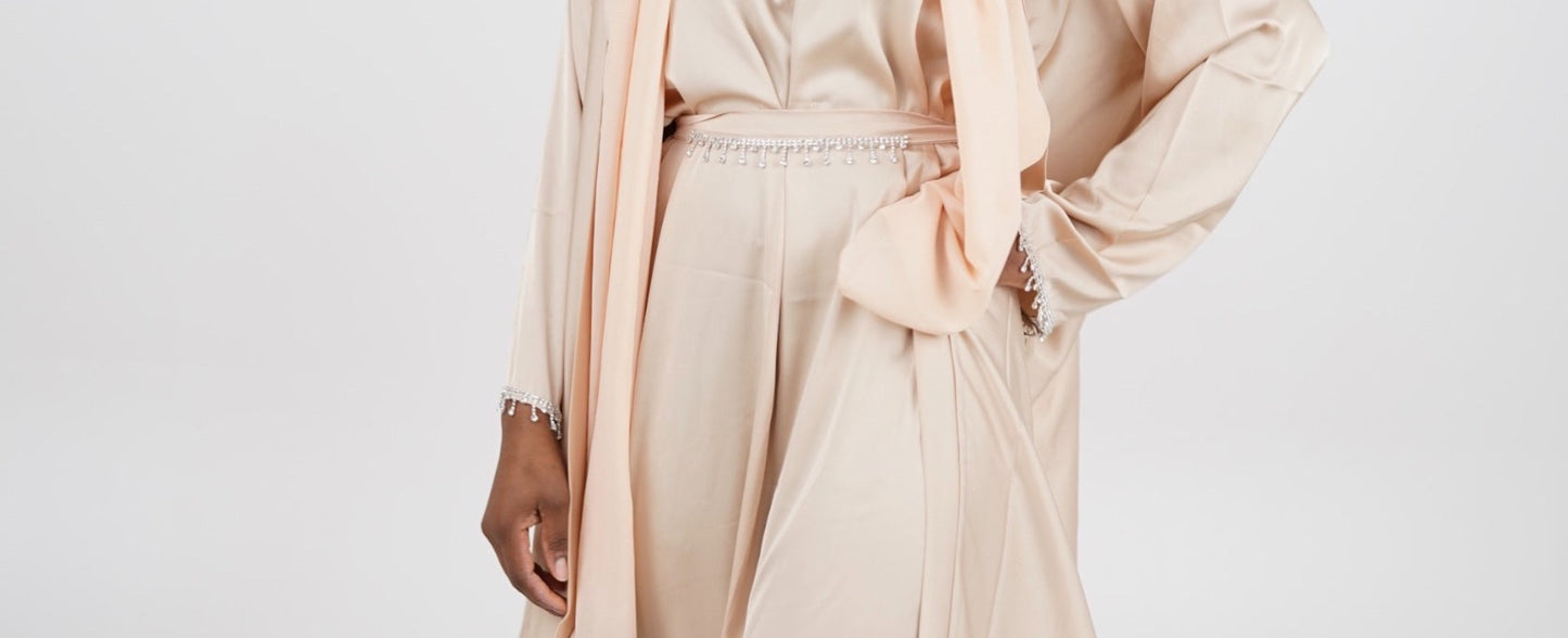 Experience the ultimate elegance with our Aneesah Abaya Beige. Made from luxurious satin material, this set includes a four-piece inner abaya and outer kimono abaya, a matching headscarf, and a belt adorned with stylish diamonds. The two-piece design includes an inner abaya and outer kimono abaya, making it perfect for any occasion. Elevate your wardrobe with this unique piece.