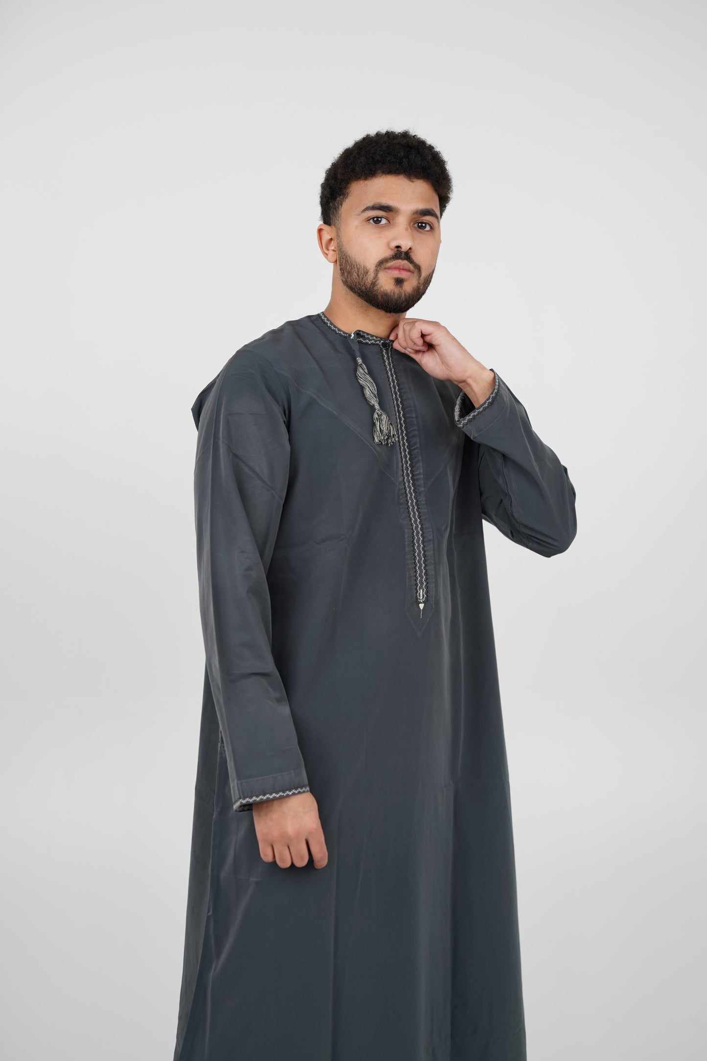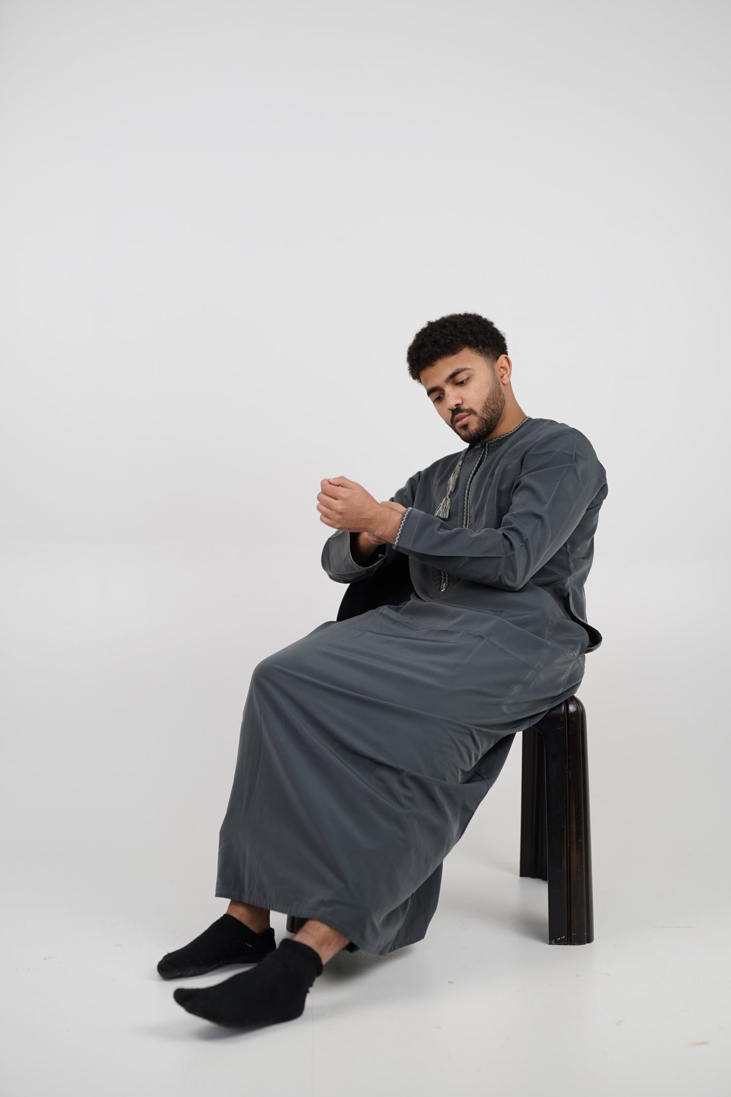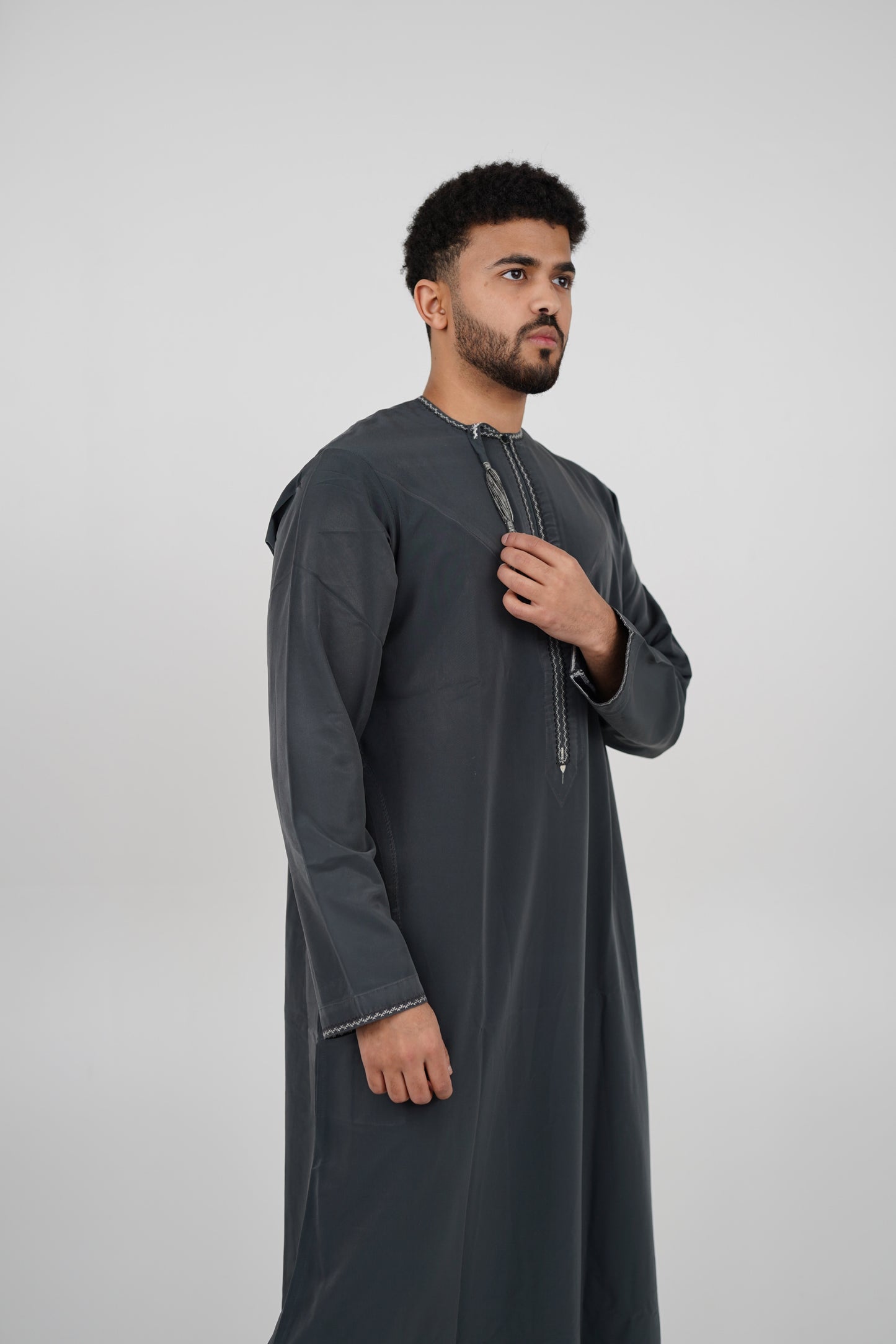 Elevate your style with the Charcoal Omani Thobe. This men's thobe boasts a striking charcoal color design, complete with an open collar and elegant hand embroidery. Made from premium materials, experience comfort and sophistication in one. Perfect for making a statement, embrace the Omani tradition with this versatile piece.