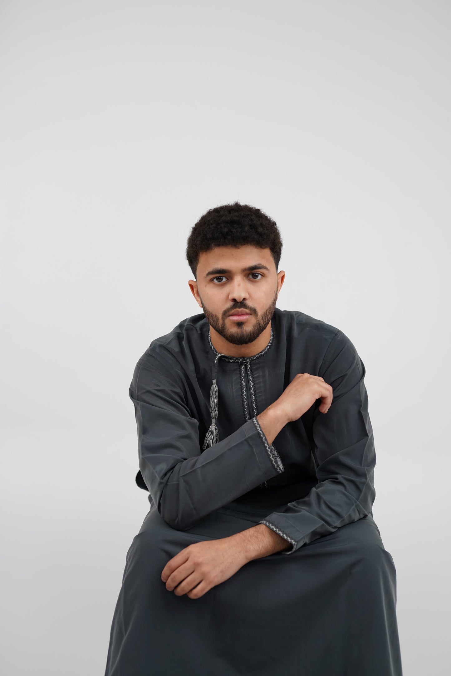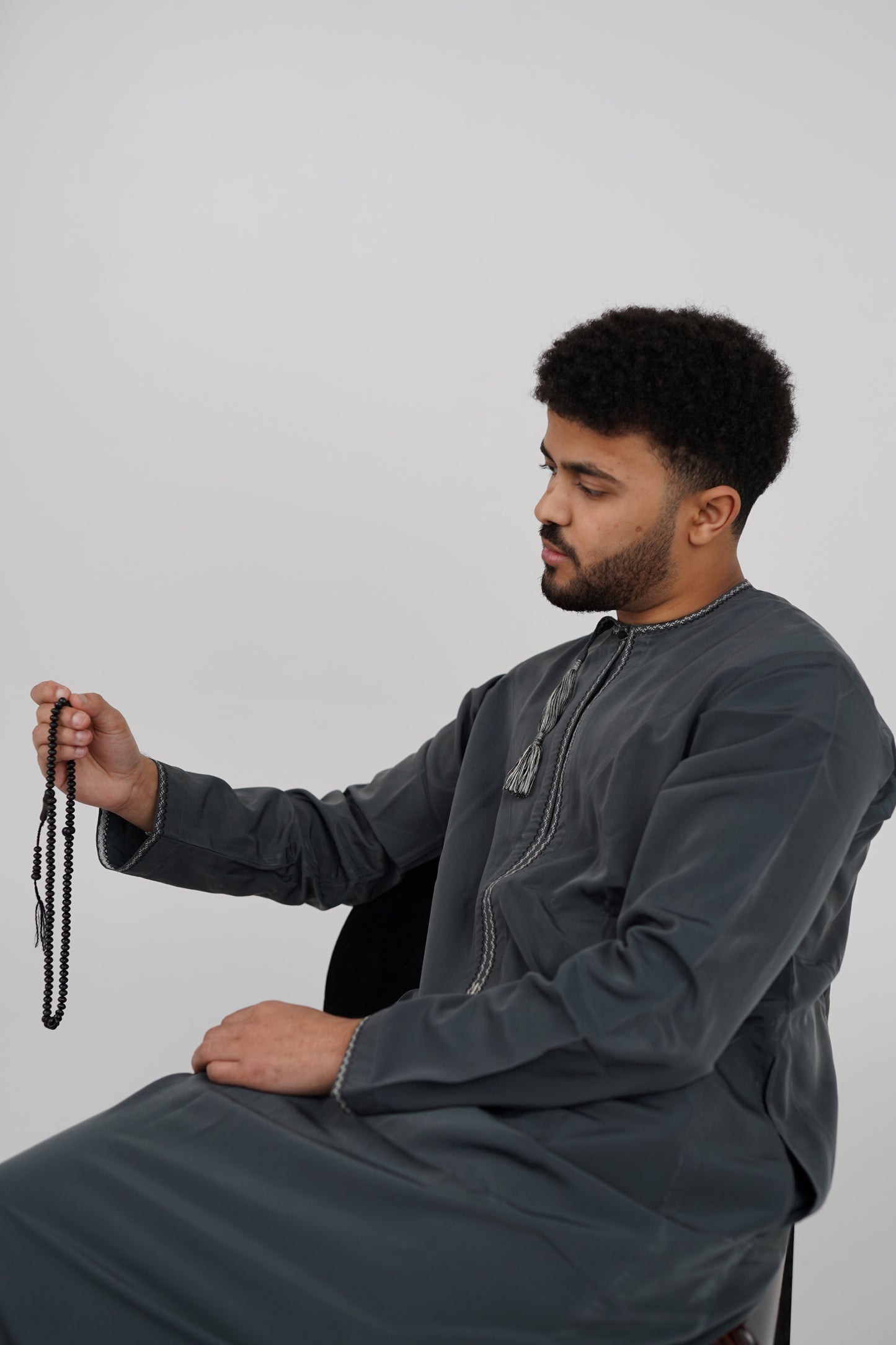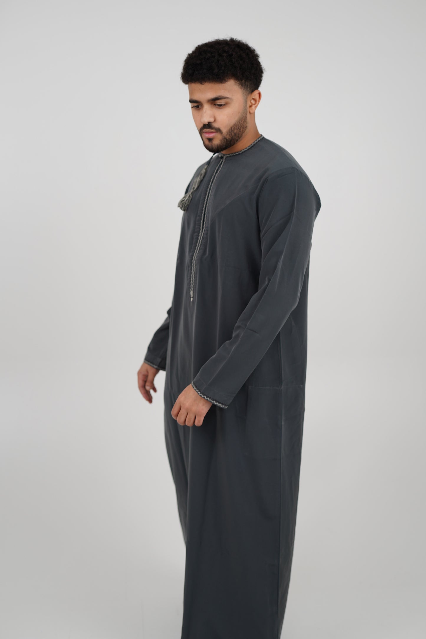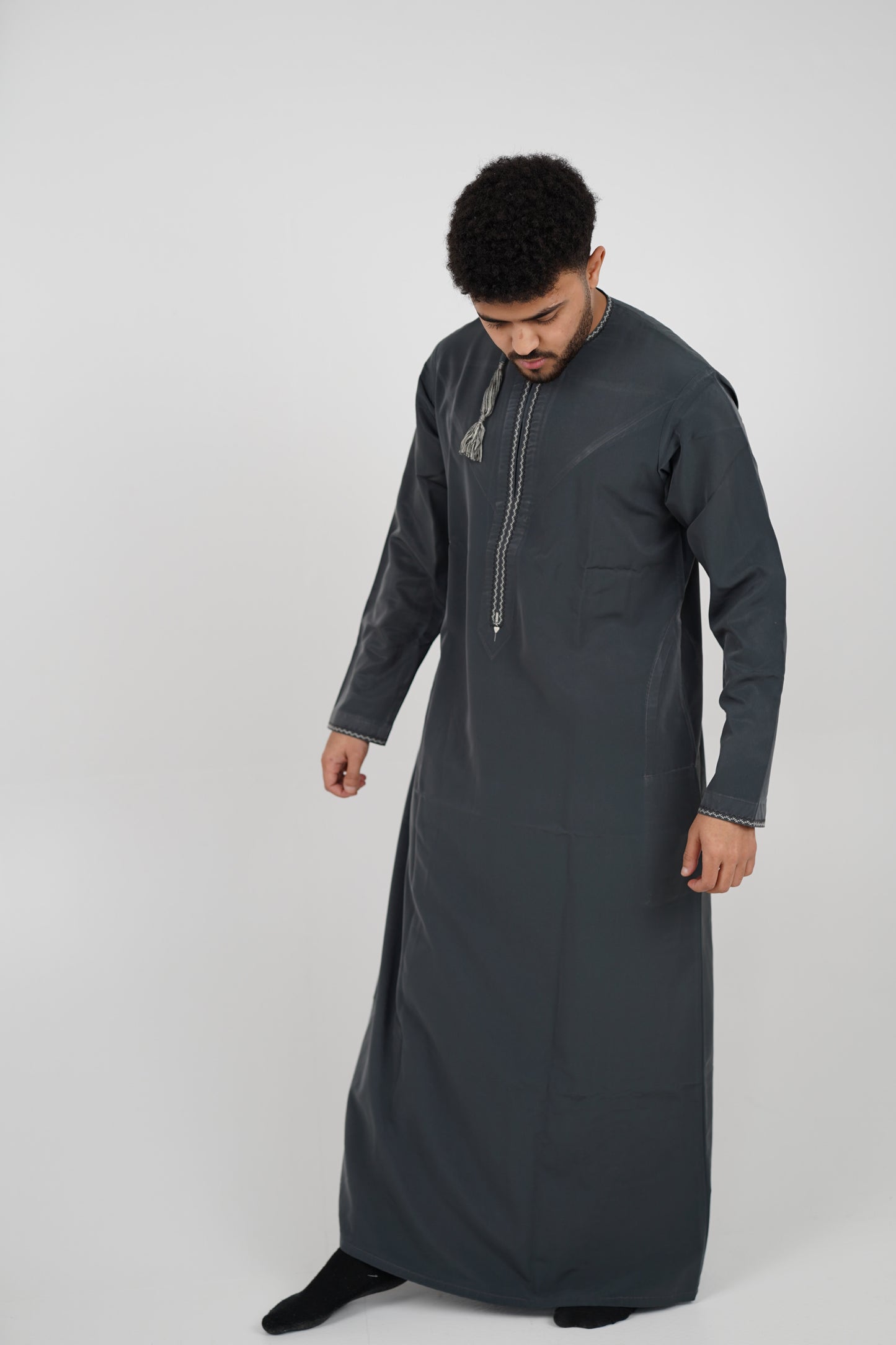 Elevate your style with the Charcoal Omani Thobe. This men's thobe boasts a striking charcoal color design, complete with an open collar and elegant hand embroidery. Made from premium materials, experience comfort and sophistication in one. Perfect for making a statement, embrace the Omani tradition with this versatile piece.