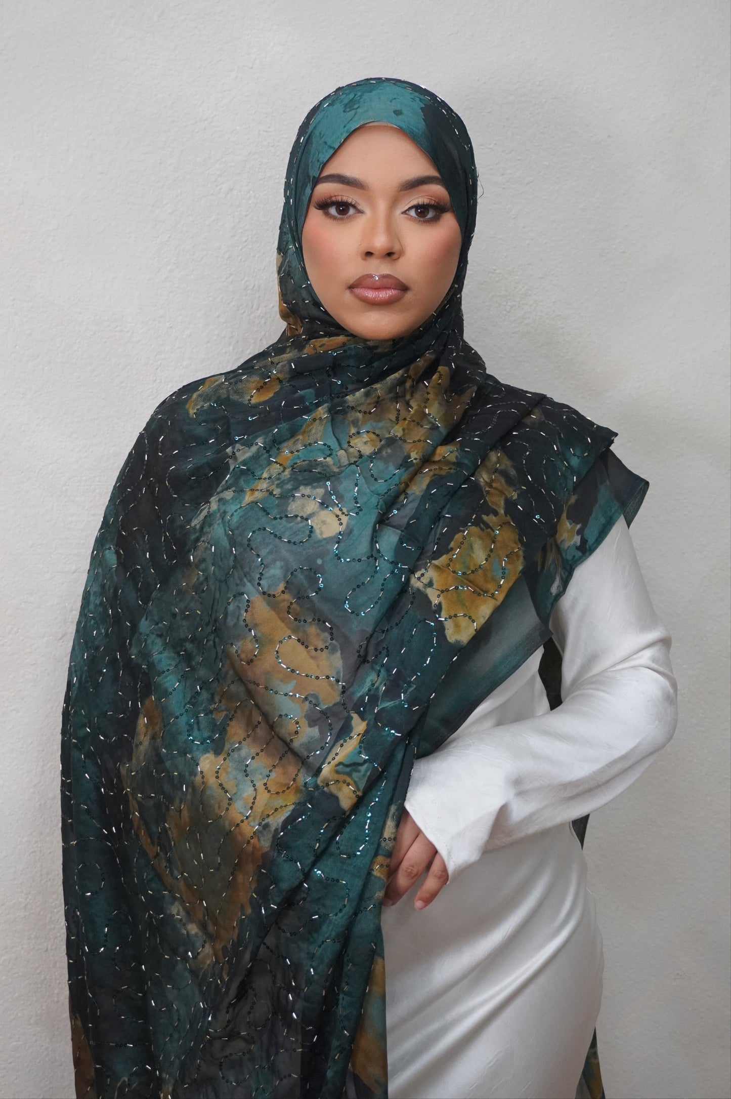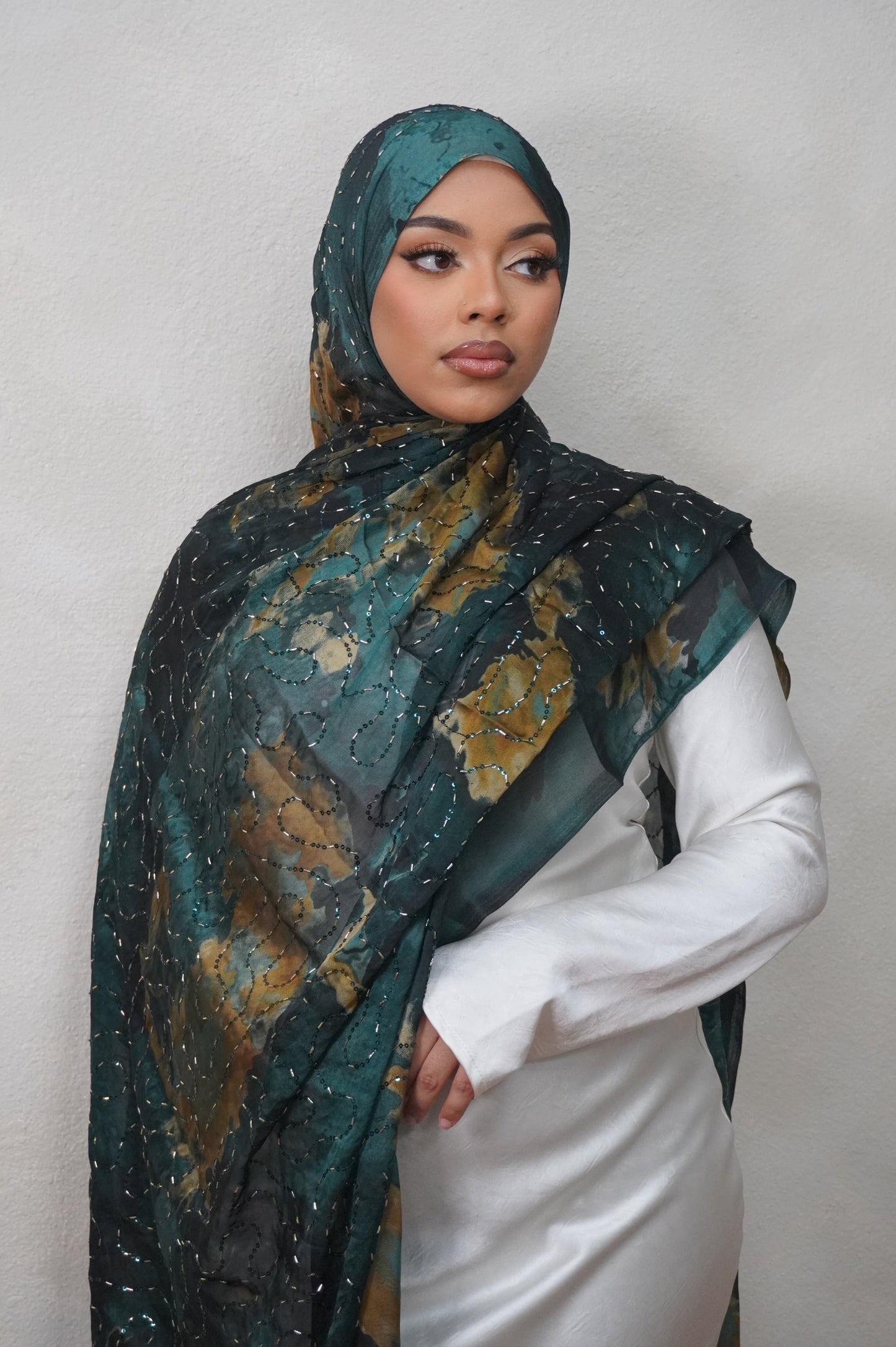Our Duniya print hijab features a stylish satin chiffon watercolor design and raw edges for a seamless lay. Perfect for staying on-trend while maintaining modesty.