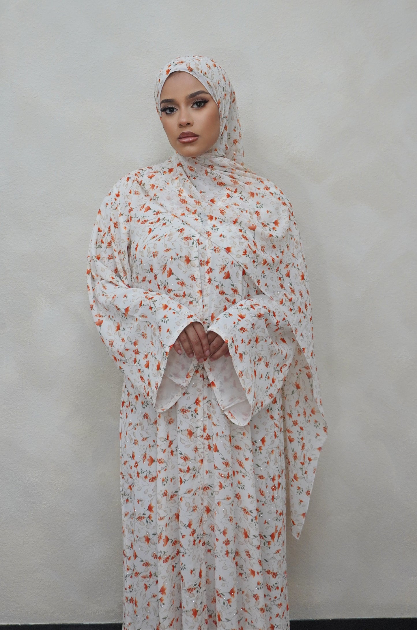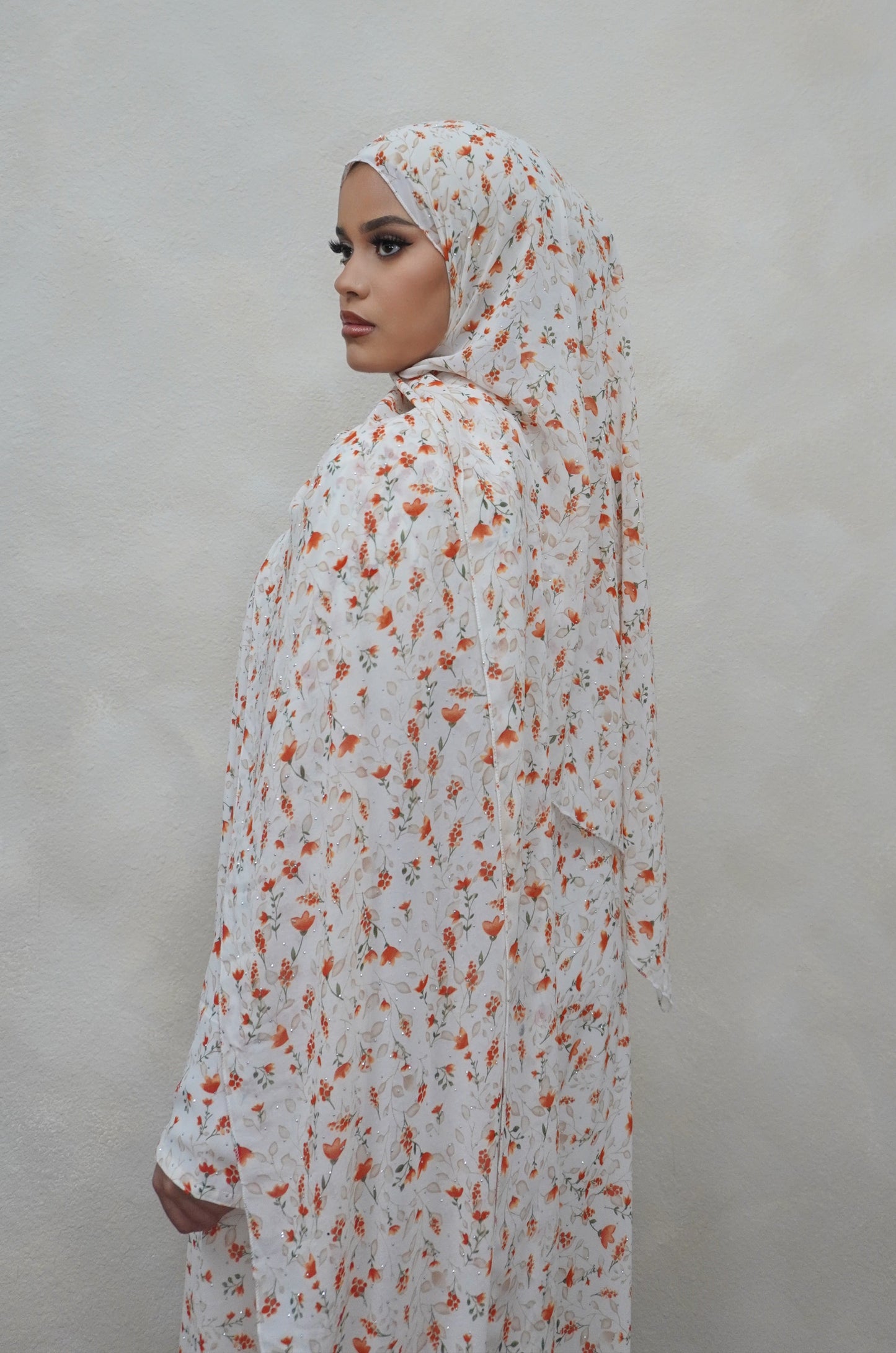 Regular price $49.99Make a statement in this elegant straight 2-piece abaya set, featuring a matching hijab and delicate black florals with golden ring accents and is delicately adorned with scattered rhinestones for a subtle shimmer. Perfect for occasions that call for a blend of modesty and modern flair, this set exudes effortless sophistication from every angle.