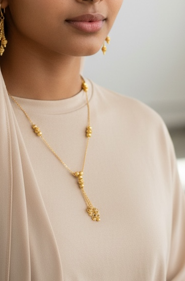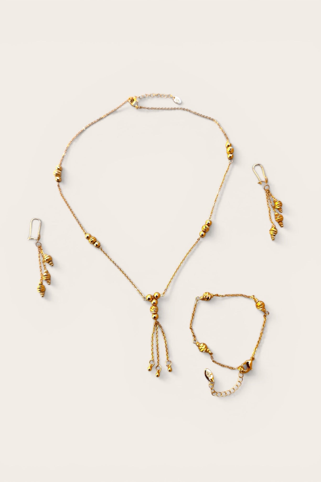 The Rimal Set (رمال) is a stunning 18K gold-plated jewelry collection featuring a delicate necklace, matching bracelet, and elegant drop earrings. Designed with textured gold beads and soft cascading accents, each piece reflects warmth and movement, creating a subtle yet captivating glow. Lightweight yet luxurious, this set embodies timeless elegance — perfect for special occasions or adding a refined golden touch to your everyday look.