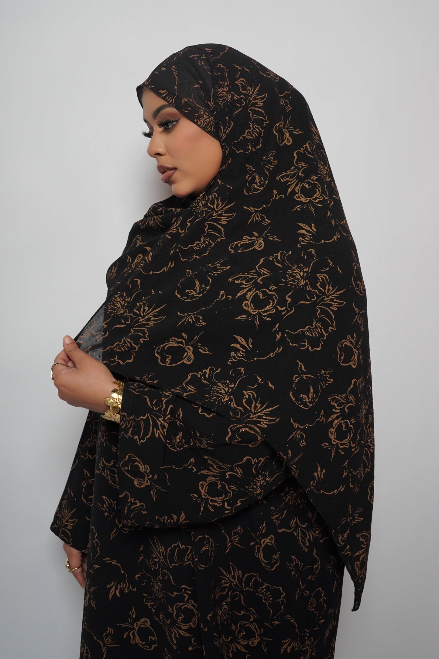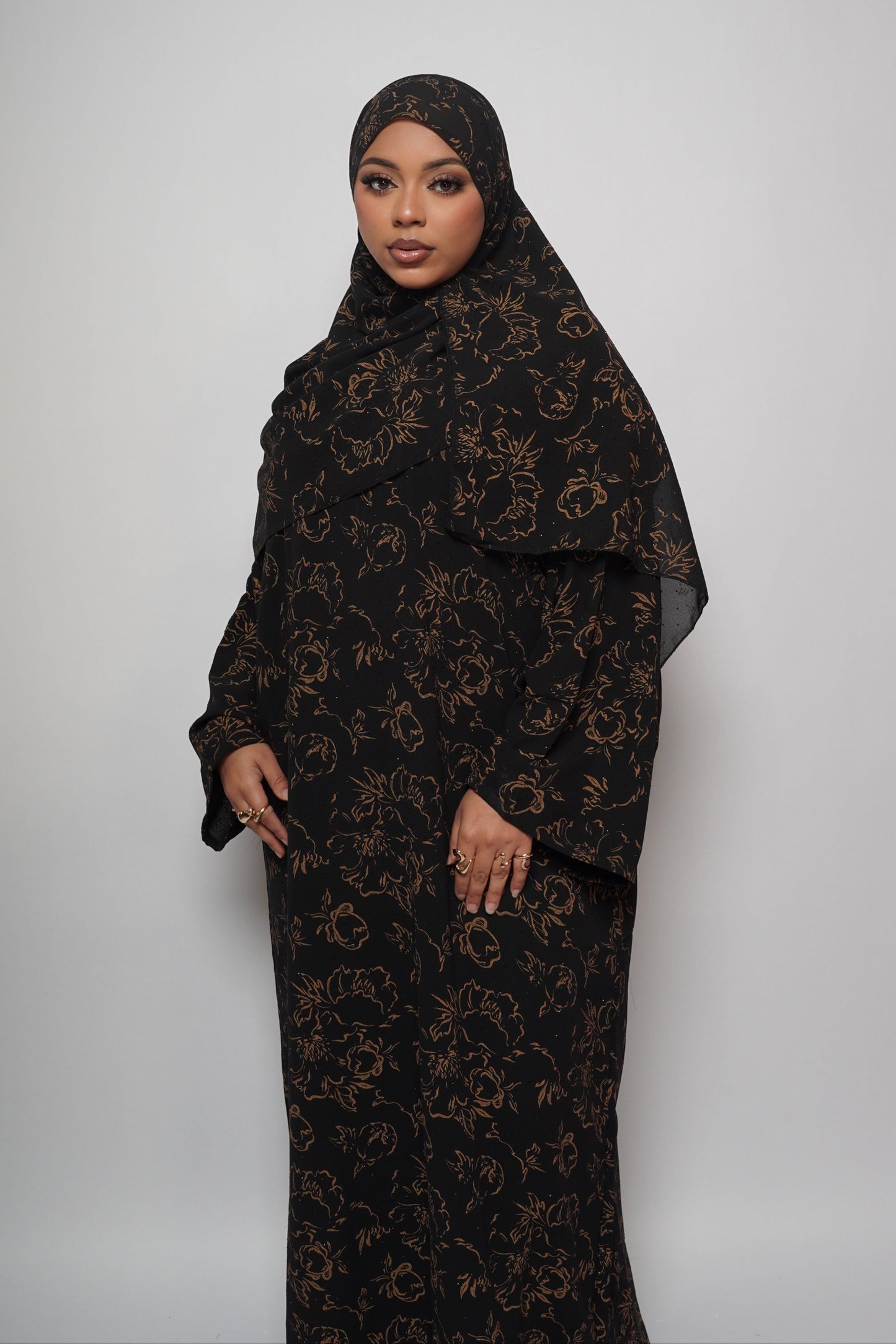 The Zahrah Abaya Set is a two-piece ensemble that blends elegance with timeless charm. It features a closed abaya adorned with intricate flower-inspired prints and delicately placed gemstones, adding a subtle sparkle to its sophisticated design. The matching hijab completes the look, making it perfect for special occasions or enhancing your everyday style with a touch of luxury.